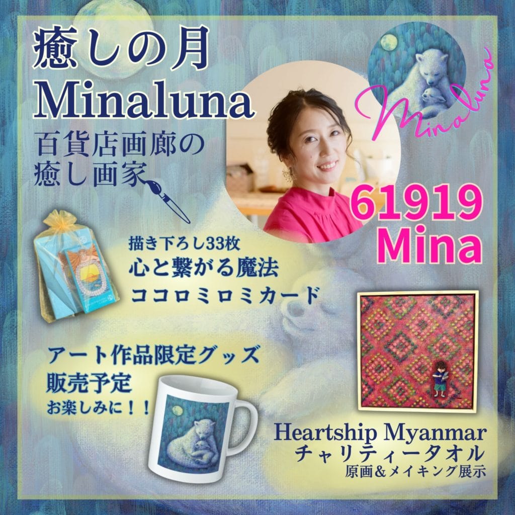 特別企画として、東武百貨店船橋、川越まるひろなど百貨店画廊で活動する画家のMinaこと木村美奈子さんが最新作を描き下ろしてくれました✨日本からの支援で文房具を受け取った子どもの写真を元にしたイラストと、背景はミャンマー、チン州の伝統布のパターンからインスピレーションを得て描かれています。